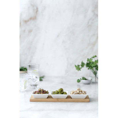 • Bandeja de bambú con 3 cuencos de porcelana en forma cuadrado/gota para servir pequeñas porciones.
