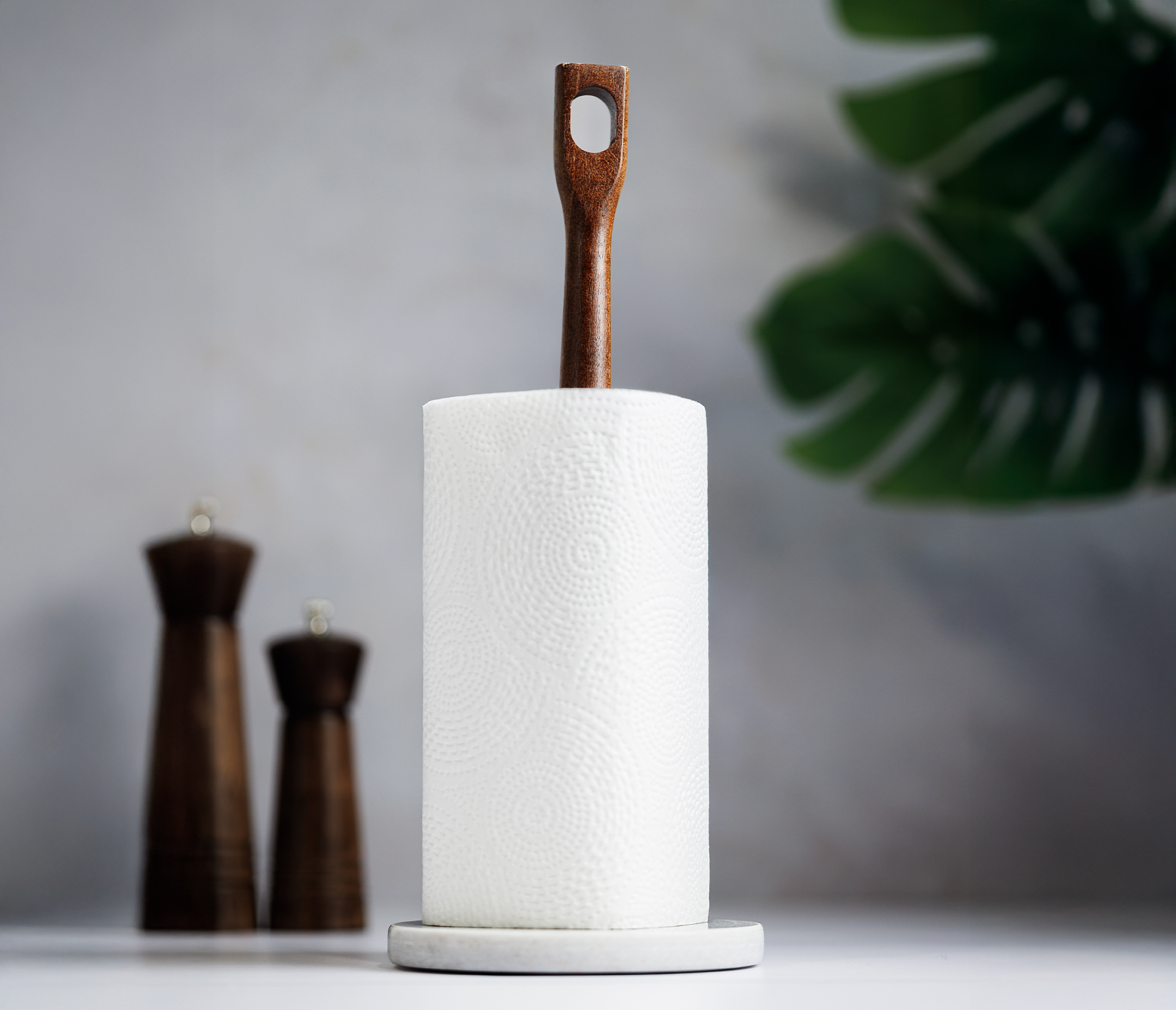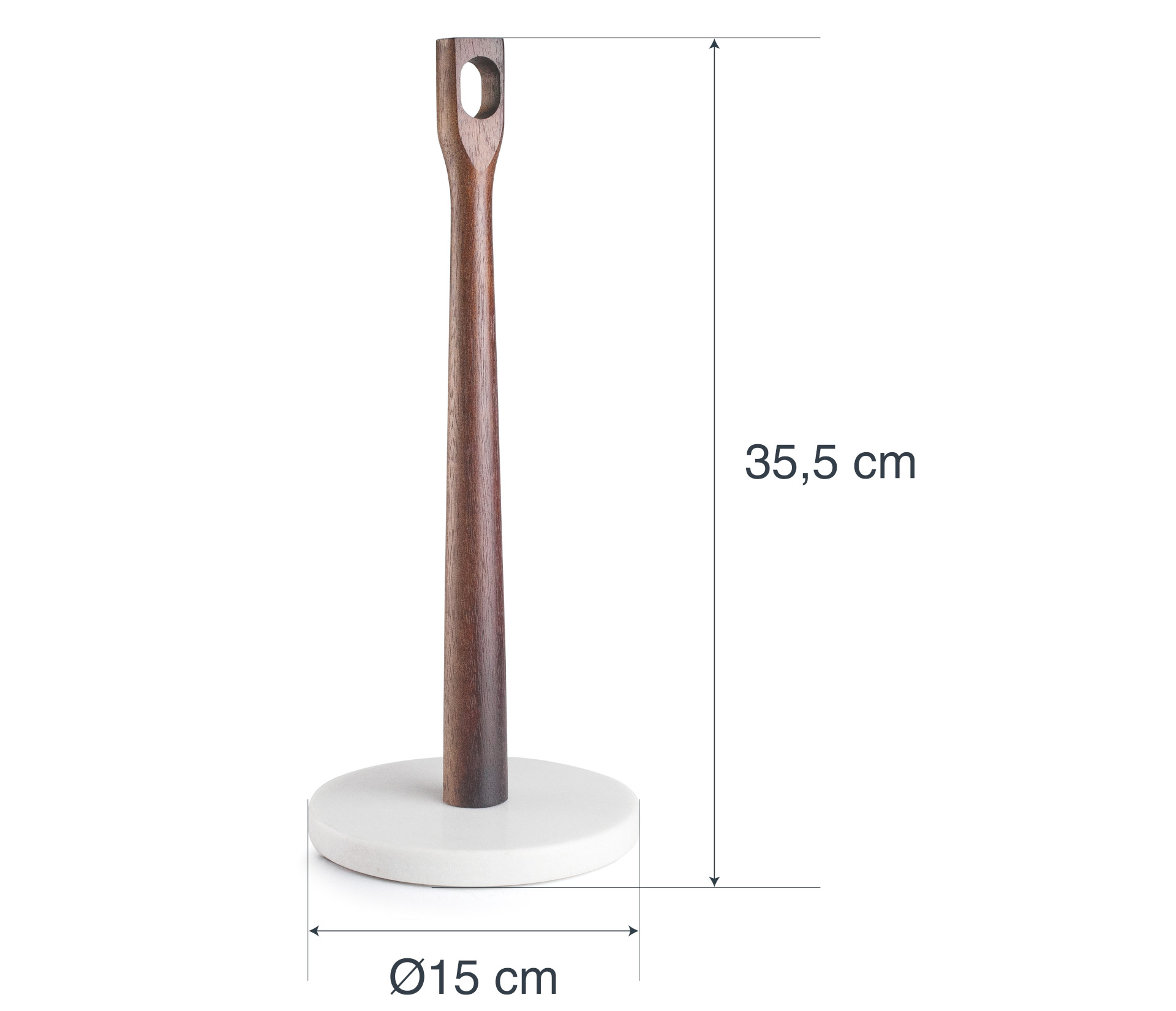 • Roll holder with natural marble base and acacia wood bar.