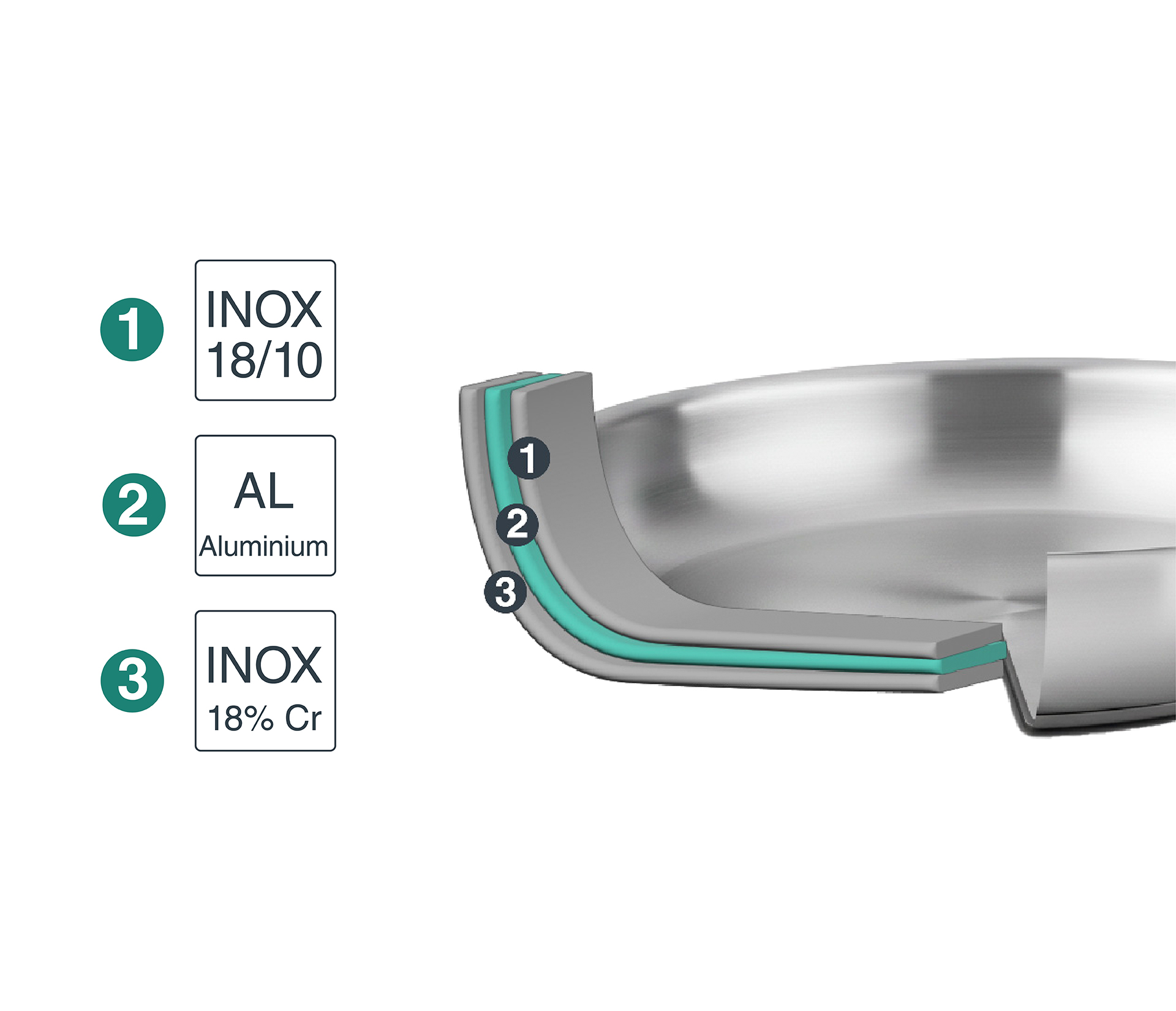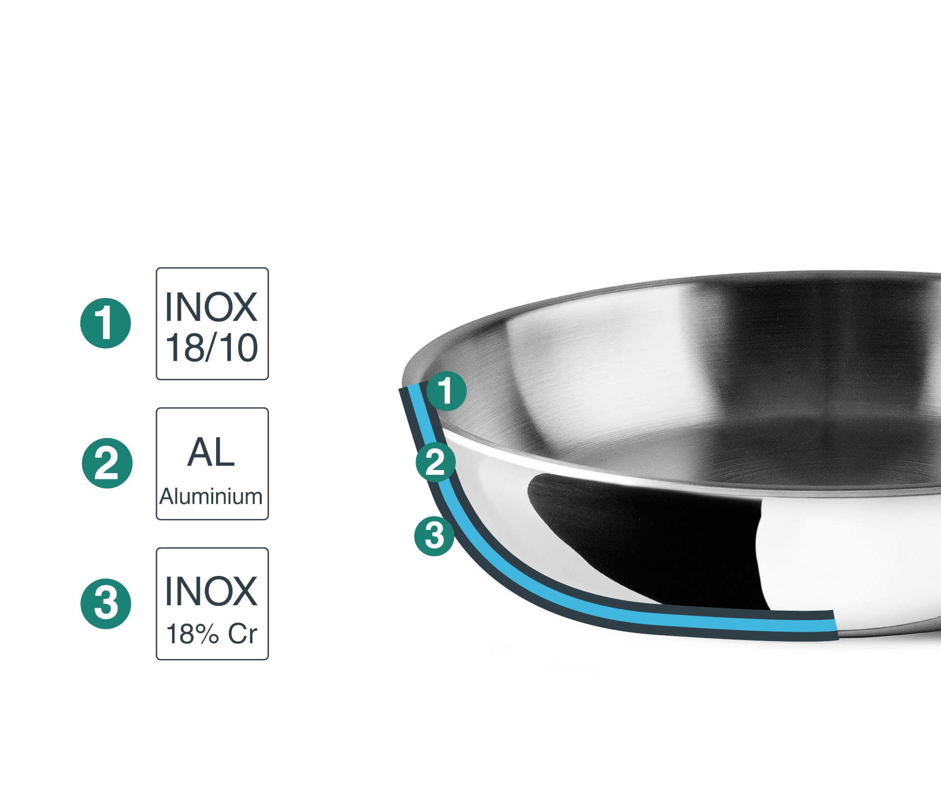 • Cuerpo fabricado en 3 capas de máxima calidad (Inoxidable 18/10 - Aluminio 1060 - Inoxidable 18%).