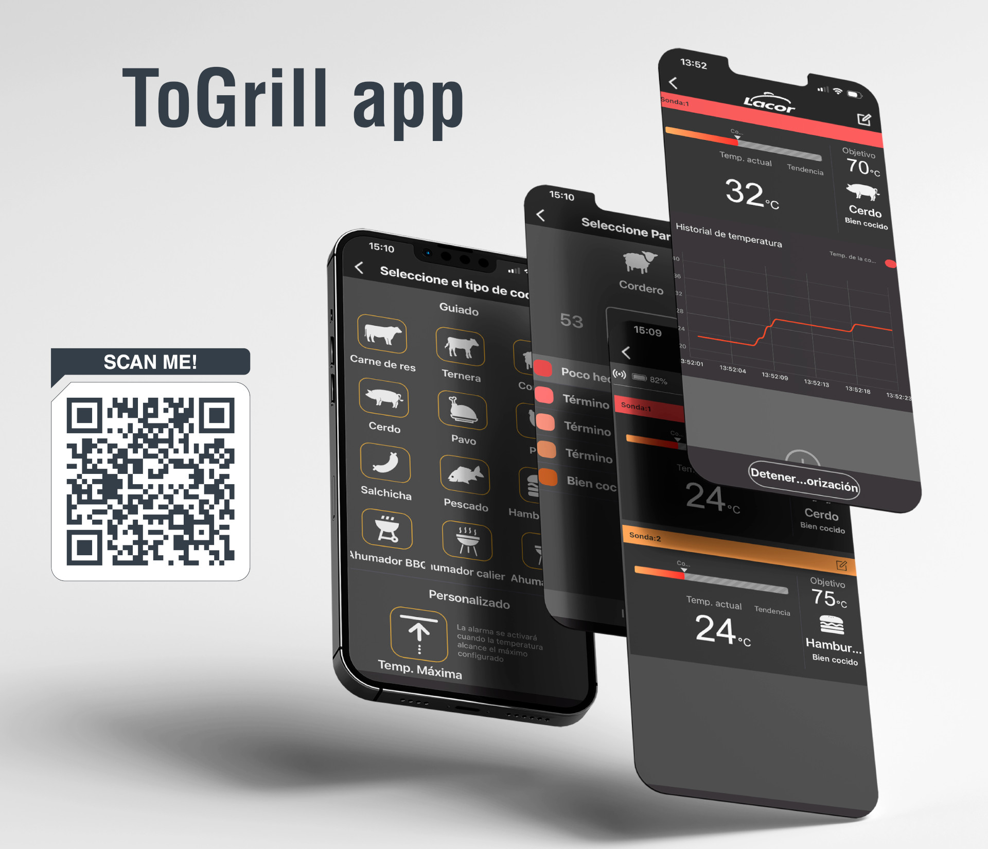 • Termómetro con Bluetooth que permite monitorear la temperatura de los alimentos de manera remota, asegurando el punto de cocción ideal desde tu teléfono.